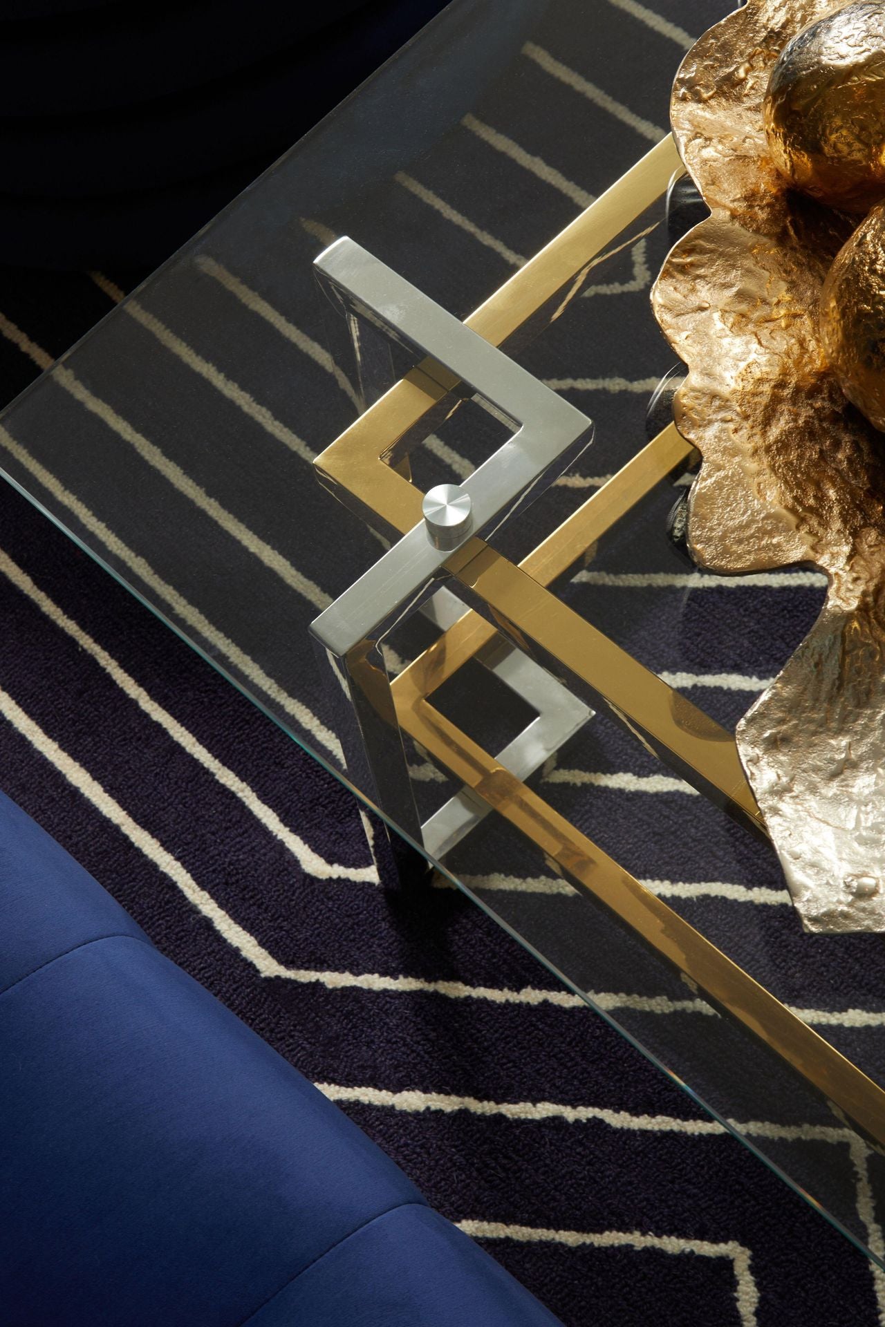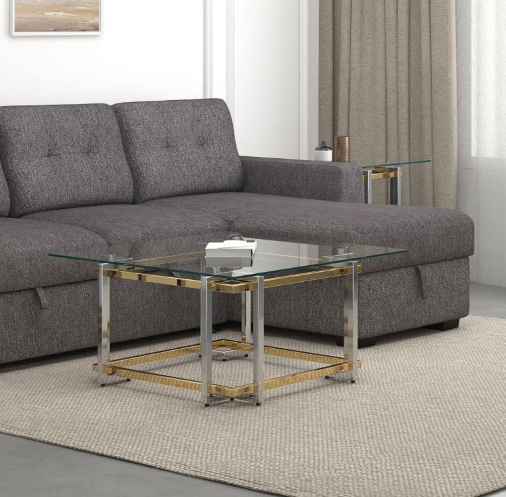 Add a touch of modern elegance to your living room with this stylish Contemporary Square Glass & Metal Coffee Table. The interlaced gold and silver finish adds a touch of sophistication to the geometric design, while the glass top provides an airy look that complements any decor. This coffee table is perfect for both formal and casual living spaces.