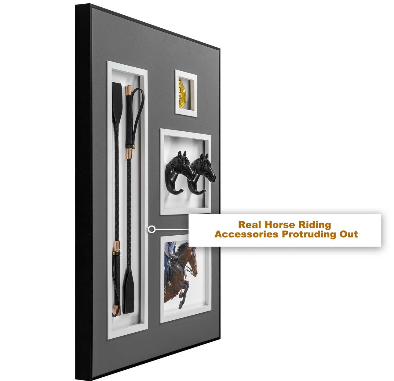 Capture the essence of the equestrian world with the Equine Essence Showcase Shadow Box. This striking piece displays an array of equestrian gear and accessories, inspiring admiration for the sport. Perfect for home offices or equestrian-themed rooms, its intricate design and attention to detail make it a cherished room decoration.